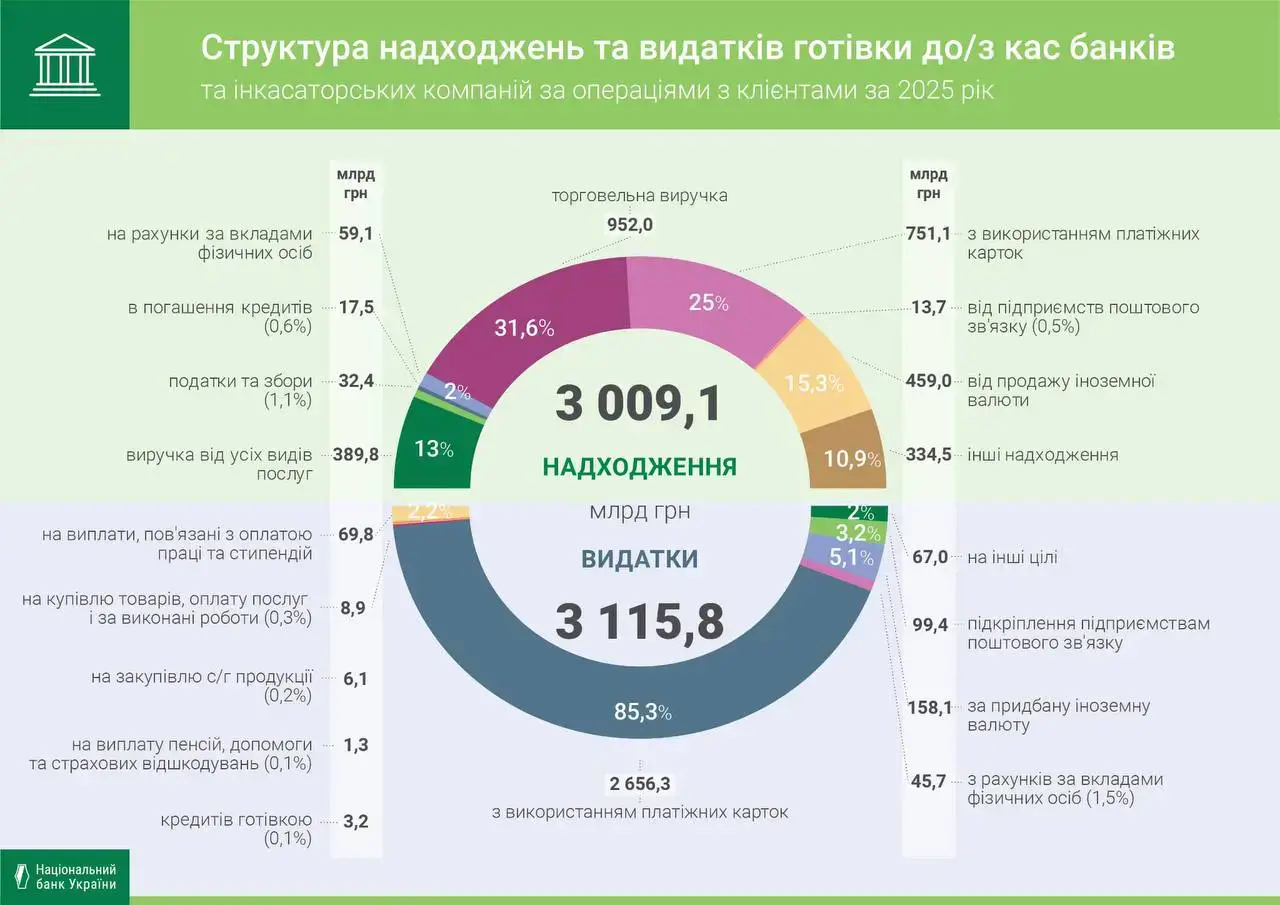 Обсяг надходжень готівки до кас банків торік збільшився на 6,7% порівняно з 2024 роком та становив 3 009,1 млрд грн (понад 3 трлн грн). Видачі готівки із кас банків за 2025 рік збільшилися дещо більше (на 8,8%) та становили 3 115,8 млрд грн