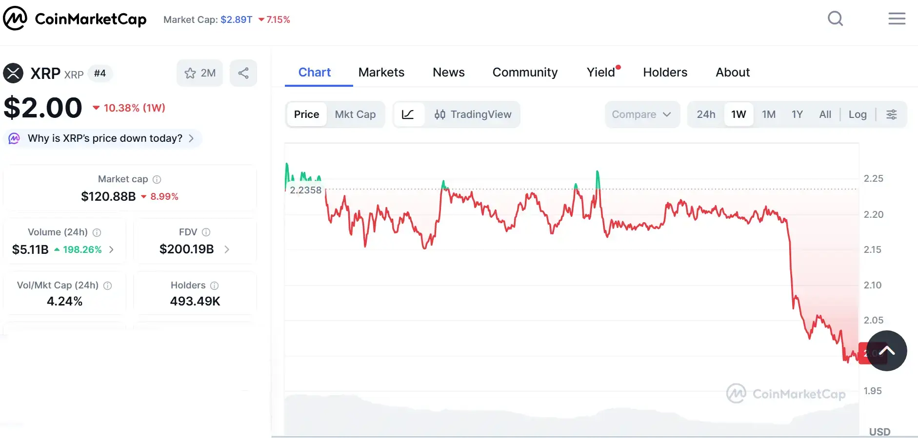 Усього за добу XRP впав майже на 9%, а його ціна становила $2, нівелювавши більшу частину імпульсу, який актив намагався відновити минулого тижня. У тижневому вимірі XRP знизився на 10,4%.