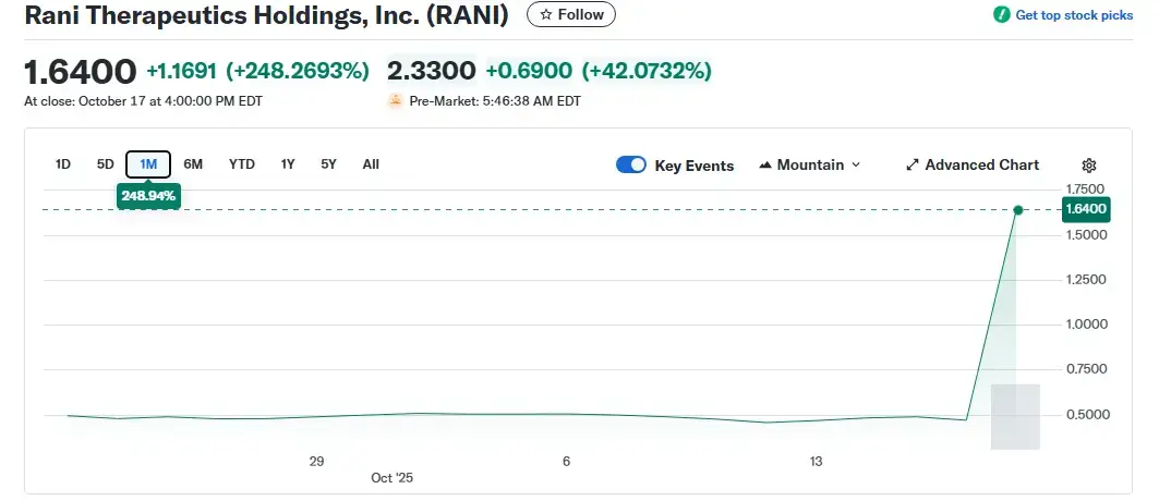 Акції Rani Therapeutics Holdings (NASDAQ: RANI) у п’ятницю стрімко подорожчали на 249% і закрилися на рівні $1,64 після оголошення про співпрацю з японською компанією Chugai Pharmaceutical
