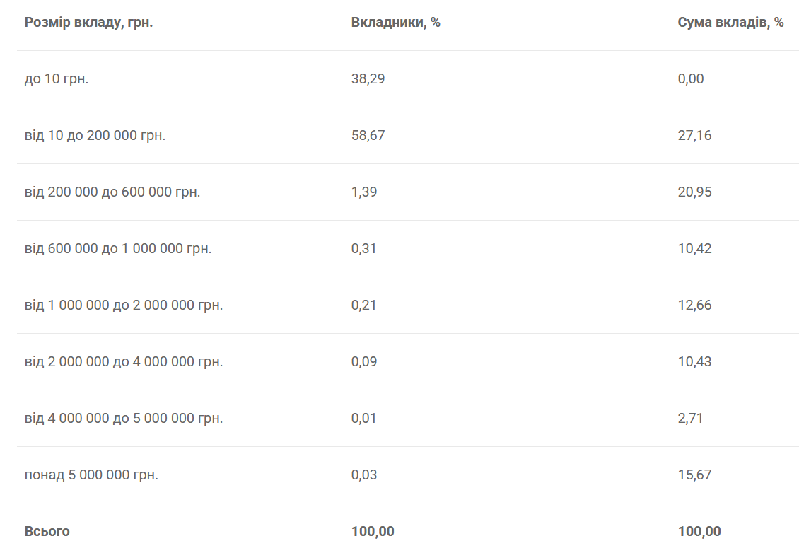 На 1 січня 2026 року розподіл вкладів фізичних осіб у банківській системі за розмірами має наступний вигляд: