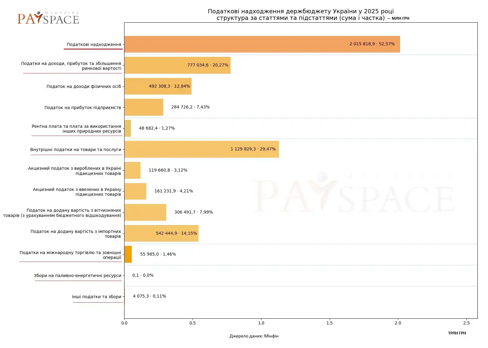 Фактично понад половину всіх бюджетних ресурсів (2,016 трлн грн) держава сформувала саме за рахунок податків, що ще раз підкреслює їхню ключову роль у фінансуванні оборони, соціальних виплат та базових функцій держави.