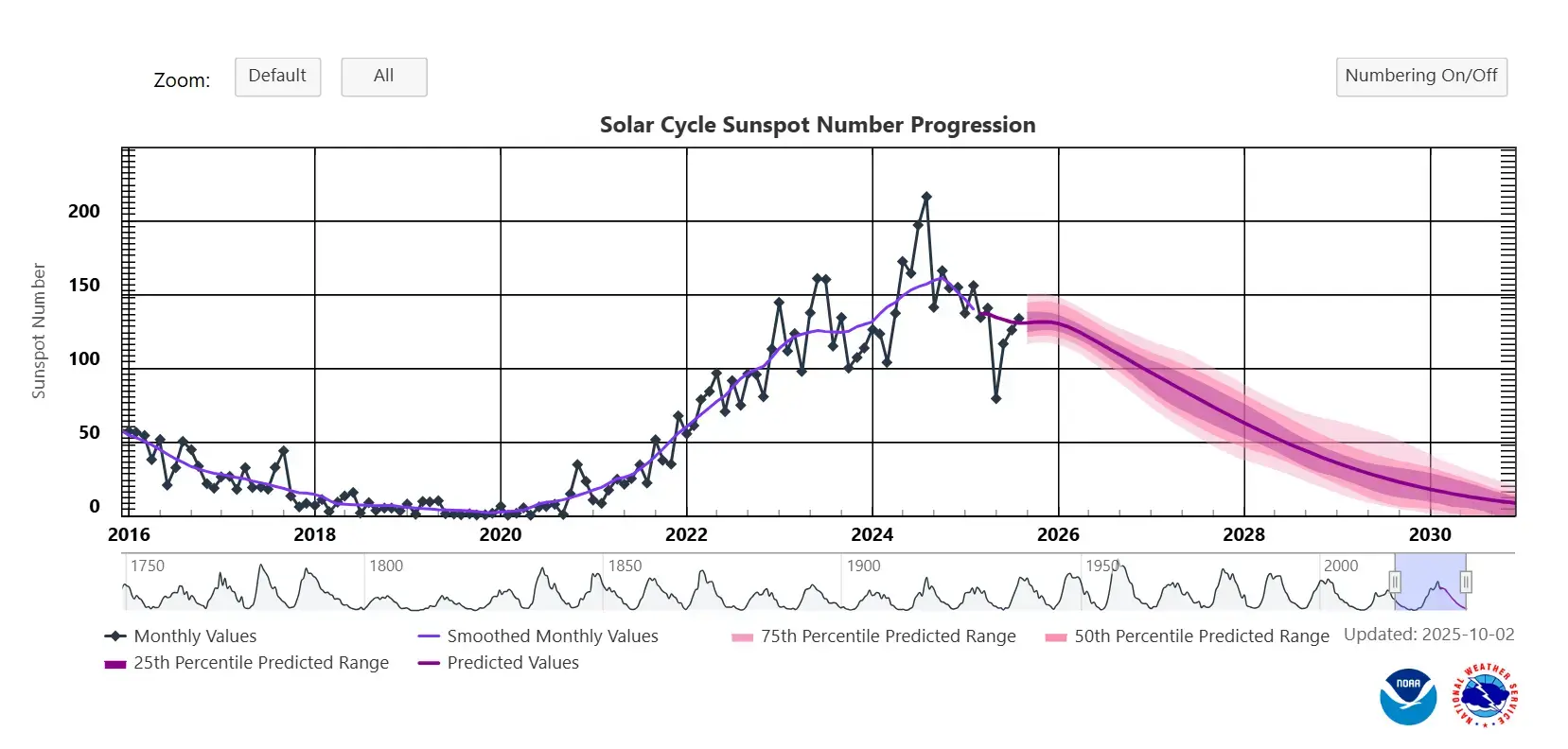 Пік поточного 25-го сонячного циклу, за даними NASA та NOAA (National Oceanic and Atmospheric Administration — Національне управління океанічних і атмосферних досліджень), припадає приблизно на середину 2025 року — орієнтовно на період з кінця 2024 до середини 2025. Саме тоді фіксується найбільша кількість сонячних плям, спалахів і, відповідно, магнітних бурь.